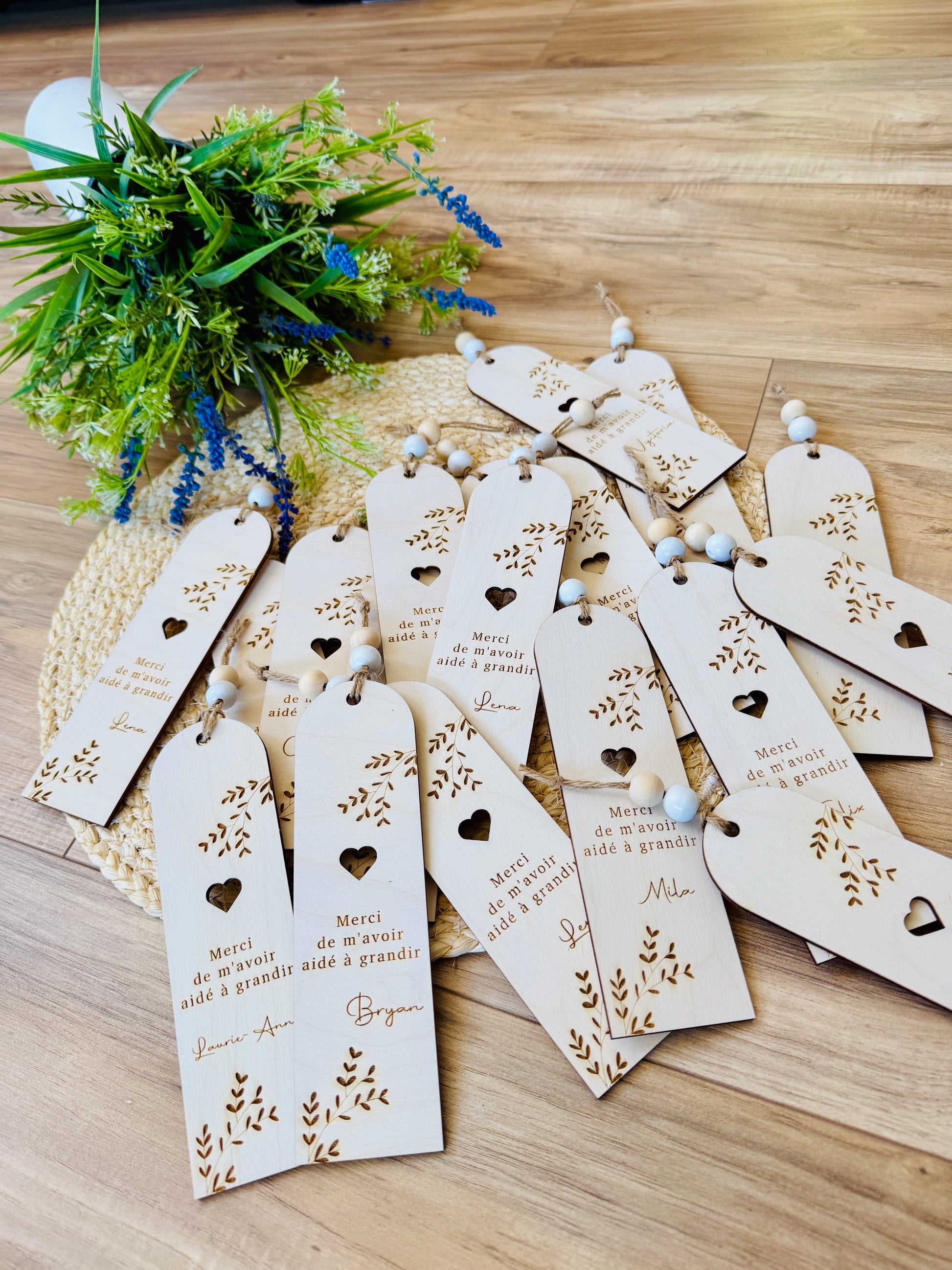Offrez un cadeau unique à vos enseignants avec notre signet en bois personnalisé. Dites-leur merci pour leur aide précieuse dans votre croissance. Réalisé en bois de qualité, ce signet sera un souvenir durable et pratique pour vos professeurs. Une façon originale de leur montrer votre gratitude.