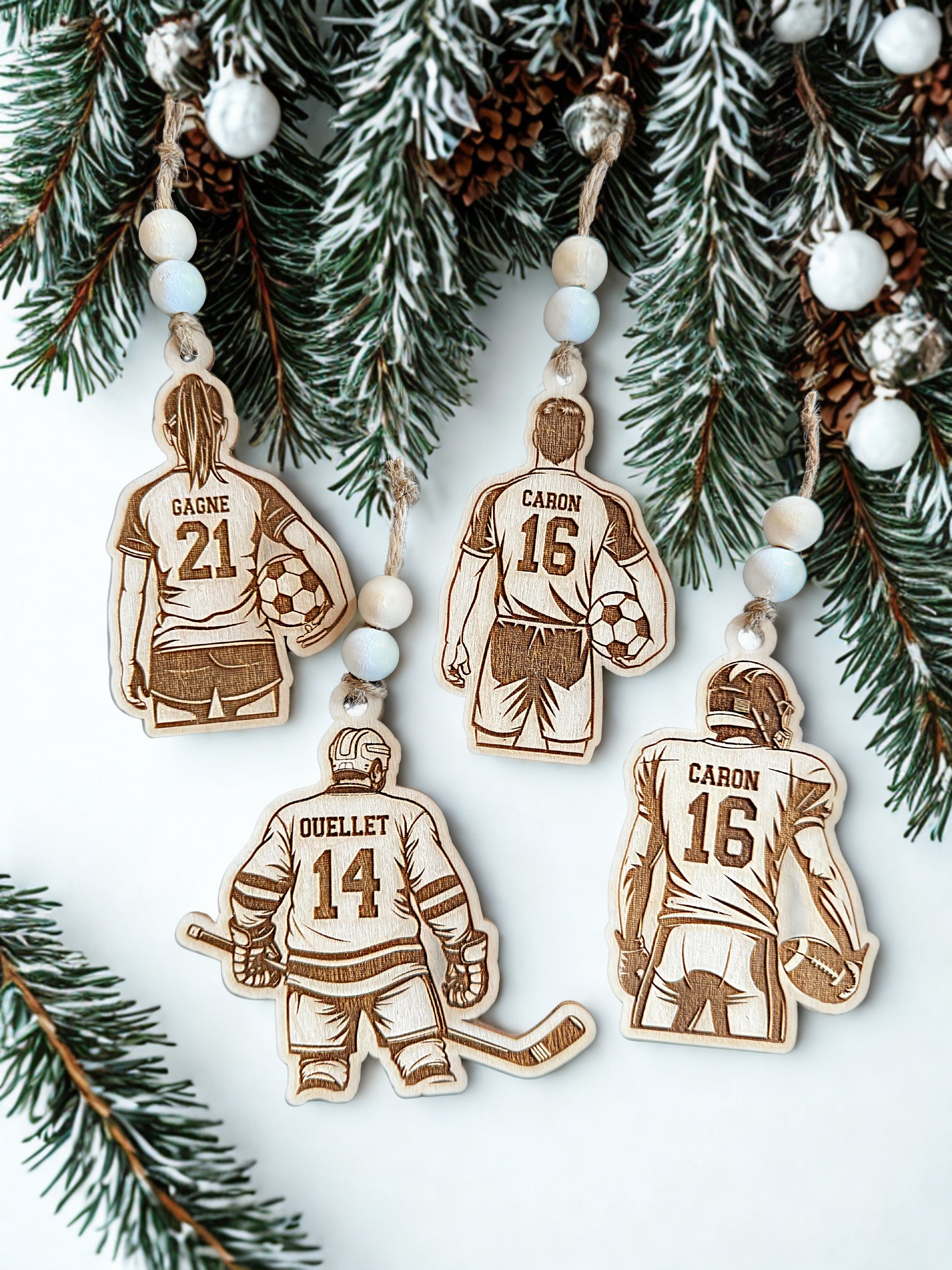 Décorez votre sapin avec style grâce à nos ornements de Noël sports en bois ! Disponibles pour le soccer, le hockey et le football, ces décorations uniques sont personnalisables avec le nom et le numéro du joueur.